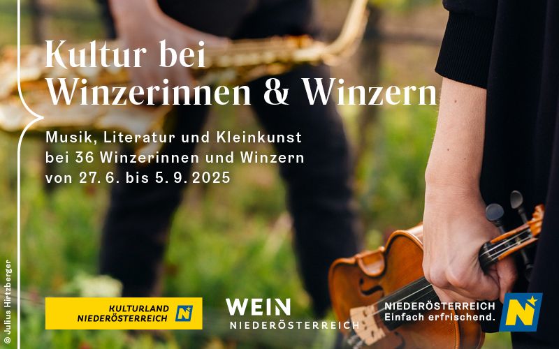 „Kultur bei Winzerinnen und Winzern“ ist eine niederösterreichweite Veranstaltungsreihe, die im Sommer 2025 bereits zum sechsten Mal stattfindet. Von 27. Juni bis 5. September 2025 erwarten Wein- und Kulturliebhaber:innen insgesamt 36 Veranstaltungen in allen 8 Weinbaugebieten Niederösterreichs. Die Veranstaltungsreihe verbindet das touristische, kulturelle und vinophile Angebot Niederösterreichs zu einem Gesamterlebnis.