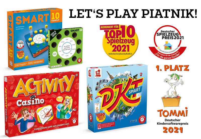 Zum heurigen Fest verschenkt Piatnik ein abwechslungsreiches Spielepaket für die ganze Familie. Reisen Sie am DKT Smart-Spielbrett durch ganz Österreich, tauchen Sie in „Activity Casino“ in die faszinierende Welt des Casinos ein oder testen Sie Ihr Wissen in der Familienedition des Kultspiels Smart 10 samt Zusatzkarten zum Thema „Food&Drink“. Piatnik wünscht Ihnen schöne, verspielte Feiertage.DKT Smart