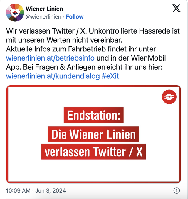 Werden Sie die Servicetweets der Wiener Linien auf X (ehemals Twitter) vermissen? Gestern verabschiedete sich das Unternehmen nämlich von der Plattform: „Wir verlassen Twitter / X. Unkontrollierte Hassrede ist mit unseren Werten nicht vereinbar”, hieß es. 75.000 Follower folgten dem Account zuletzt. | | Das war's: Die Wiener Linien sagen Adieu zu X (ehemals Twitter) (©Screenshot X/Krenn) | Dass die Hasskommentare unter den Tweets der Wiener Linien zunehmen, bemerkte das Unternehmen besonders seit der Übernahme durch Unternehmer und Milliardär Elon Musk. Er entließ über 1.000 Mitarbeiter, die für die Moderation von Beiträgen und gegen die Verbreitung von Hassrede verantwortlich waren. Zugleich ließ er tausende zuvor gesperrte Accounts mit der Begründung der Redefreiheit wieder freischalten. Die Wiener Linien posteten auf X vor allem Hinweise, wenn eine Straßenbahn ausfiel oder eine Baustelle für Verzögerungen auf einer U-Bahnlinie sorgte. Eine Pressesprecherin sagt, sie wisse, dass „Öffi-Inhalte emotionalisieren”. Aber zuletzt seien keine „konstruktiven Diskussionen mehr möglich” gewesen. Vor allem während des Pride-Monats, wenn einige Straßenbahnen mit der Regenbogenflagge durch Wien düsen, kämen viele Hassnachrichten. „Selbst wenn wir das an X gemeldet haben, passierte nichts”. Der Abschied hat einen weiteren Grund: Die Wiener Linien brauchen die Plattform nicht mehr. Wenn Linien ausfallen oder sich Öffis verspäten, kommunizieren sie das über ihre eigene Mobil-App. Auf Instagram und Facebook bleiben sie den Usern allerdings erhalten.