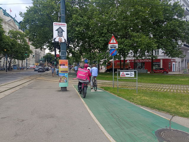 | Der Ring-Radweg am Julius-Raab-Platz: Viel Platz zum Überholen bleibt nicht. (© FALTER/Pechtl) |