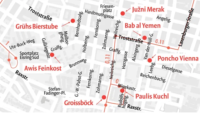 Grätzelrundgang | Neilreichgasse (1100) | | © ARGE KARTO | Bei der Endstelle des O-Wagens finden sich ein paar durchaus bemerkenswerte Gastronomien, alte wie neue, hier findet sich ein Grätzel mit viel Platz, breiten, geraden Straßen, vielen Bäumen und äußerst interessanten Beispielen des sozialen Wohnbaus aus etwa 90 Jahren. Die Raxstraße bildet die räudige Südgrenze dieses Grätzels, deren Hässlichkeit ein Betrieb mit Inbrunst trotzt. Hier befindet sich das Hauptsitz der Wiener Bäckerei Groissböck. Gebacken werden Retro-Klassiker wie „Rehrücken“ oder „Indianer“, Schaumrollen gibt’s von daumengroß bis zu einem Meter Länge. Aktuell dreht sich beim Groissböck alles um den Fasching – man sparte auch nicht bei der Dekoration – und dessen Germteig-Ikone, den Krapfen. Um den Hof herum dann gleich das nächste Highlight, nämlich Paulis Kuchl, ein adrettes, gutbürgerliches Gemeindebau-Gasthaus mit hübschem Gastgarten und Wiener Küche in einer Qualität, wie man sie bis zum Reumannplatz nicht findet. Die Spezialität von Paul Putzlager, der das Lokal vor zehn Jahren übernommen hat, ist das Beef tatar, Donnerstag ist Schnitzeltag. Ein ganz anderes Programm bietet das Poncho Vienna von Muhammed Bozkurt, nämlich French Tacos: ein Fladenbrot, das mit Pommes frites, Käsesauce, Fleisch und noch so allerhand gefüllt, gefaltet und dann waffelgleich getoastet wird. Nächste Station Troststraße, zu Bab al-Yemen, auch in einem eindrucksvollen Gemeindebau untergebracht und eines von nur zwei jemenitischen Restaurants in Wien. Bab al-Yemen führt 19 Restaurants weltweit, die Küche ähnelt anderen arabischen Küchen, wirkt aber ein wenig ursprünglicher – vor allem, wenn man sie am Boden sitzend mit den Händen isst. Spezialität ist Lamm Mandy, langsam im Steinofen gekocht, oder Haneeth, mariniert und langsam gebraten. Den ganzen Grätzelrundgang von Florian Holzer mit allen in der Karte erwähnten Lokalen finden Sie hier. |