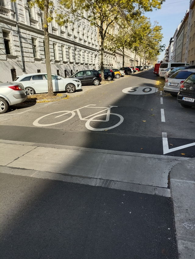 „Eine fahrradfreundliche Straße” soll sie sein. Aber Radweg ist hier keiner zu sehen – lediglich ein großes Fahrrad-Piktogramm am Boden. Querende Fahrzeuge haben keinen Rechtsvorrang, und die wenigen kleinen Erhöhungen, die auf der Fahrbahn angebracht wurden, dürften Autos nicht wirklich zum Bremsen anregen. Gut geschützt vom Verkehr fühlt man sich als Radfahrerin hier nicht; das wäre, wie eine Studie der TU Wien zeigt, nur mit einem baulich getrennten Radweg oder einer Fahrradstraße (Autos dürfen die Straße queren, aber nicht durchfahren) der Fall.