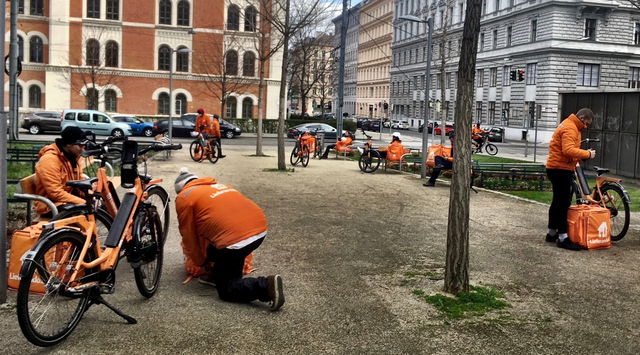 Neun von zehn meiner Fahrerkollegen sind Migranten oder waren vorher monatelang arbeitslos. Hasi, der vor sechs Jahren aus dem Iran nach Österreich kam und mit mir als Fahrradkurier arbeitet, war bis vor Kurzem bei Mjam als Fahrradkurier beschäftigt. Vier Euro pro Auftrag habe er dort bekommen. „An manchen Abenden, wenn wenig los war, habe ich fast gar nichts verdient”, sagt er.