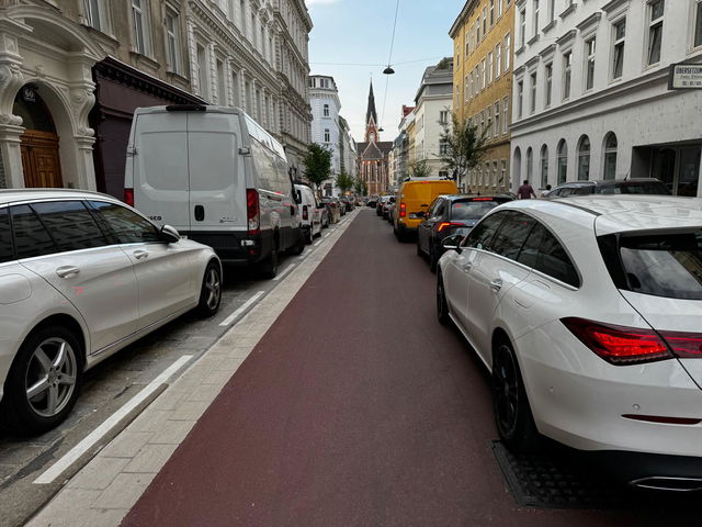 Schlechtes Vorbild Die Fahrradstraße in der Argentinierstraße hätte ein Beispiel für eine sichere Radinfrastruktur werden sollen. Derzeit herrscht dort aber Verkehrschaos. Sie sollte ein „Vorzeigeprojekt” werden, ein „innovatives Konzept nach niederländischem Vorbild”, das „neue Maßstäbe für die Radinfrastruktur” setzt. So beschrieben rote und pinke Stadtpolitiker die Fahrradstraße in der Argentinierstraße bei Baubeginn im November 2023. Neun Monate später ist der Abschnitt zwischen Gürtel und Theresianumgasse fertig. Fahrradsymbole sind auf die rot gefärbte Straße aufgemalt, mehr Bäume gibt es auch, aber von einem Vorzeigeprojekt für sichere Radwege-Infrastruktur kann kaum die Rede sein. Auf der Straße stauen sich zur Rushhour die Autos (zu sehen auf diesem Video) Radler kommen nur schwer an ihnen vorbei. Was läuft schief? |